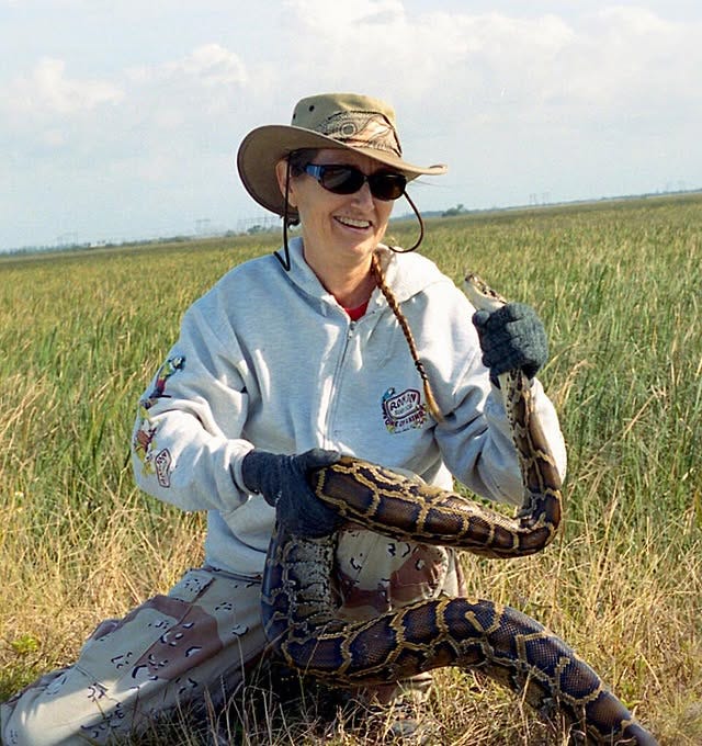 And now I can’t stop thinking about Donna Kalil, 63, driving through the Everglades with pink on her shoulders and a mission in her heart; grabbing pythons, smiling big and shouting “Whoohoo” into the wild.