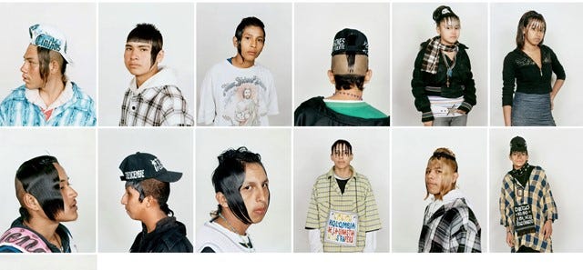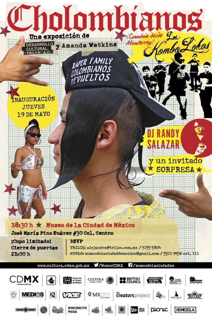 En Monterrey, la Kolombia no es solo estética: es identidad. Son camisas de cuadros gigantes, jerseys de equipos americanos, pantalones hasta la pantorrilla, Converse, peinados imposibles que desafían la gravedad y las reglas: rapados por detrás, picos arriba pintados de colores, flecos rectos sobre las cejas y patillas enormes. Toy Selectah lo describe perfecto: “una mezcla bastarda de los chicanos de East LA con la sensualidad caribeña”.